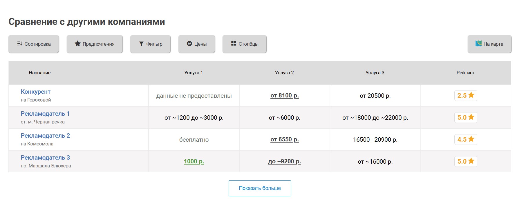 Вокруг продвигаемой таким образом бухгалтерии выбирается некоторое количество ближайших конкурирующих бухгалтерий, продвигаемая бухгалтерия попадёт к ним в таблицу «Сравнение по ценам», которая выглядит следующим образом: